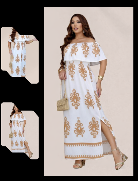 Vestido longo em crepe com modelagem ombro a ombro e estampa sofisticada, cor caramelo. Ideal para looks refinados, trazendo charme e feminilidade.